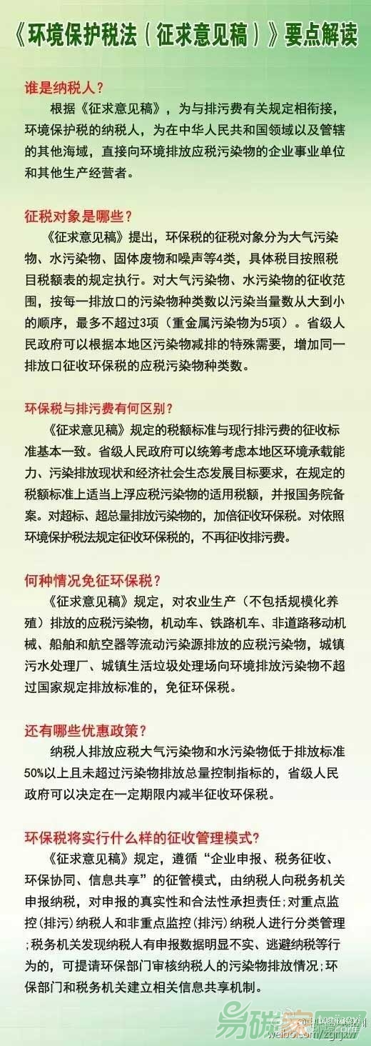環(huán)保費(fèi)改稅,一個(gè)字的變化卻代表著一個(gè)時(shí)代的更迭。昨日,國(guó)務(wù)院法制辦全文披露了國(guó)家財(cái)政部、稅務(wù)總局和環(huán)保部起草的《中華人民共和國(guó)環(huán)境保護(hù)稅法(征求意見(jiàn)稿)》(以下簡(jiǎn)稱“征求意見(jiàn)稿”),并正式向社會(huì)征求意見(jiàn)。隨著征求意見(jiàn)稿的出爐,有關(guān)環(huán)保稅下一步如何與排污費(fèi)銜接、如何與現(xiàn)有相關(guān)稅收配合等