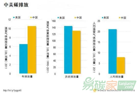 碳排放峰值,并“爭取提早實現(xiàn)目標(biāo)”。到2030年,中國還將把非化石燃料占一次能源消費比重從2013年的8.8%提高到20%左右。而美國承諾到2025年溫室氣體排放量將比2005年減少26%至28%,目前該承諾已正式納入美國的國家自定貢獻。值得注意的是,協(xié)議簽訂時,中國當(dāng)前年排放量雖有所上升,但其歷史和人均排放量仍遠低于美國。