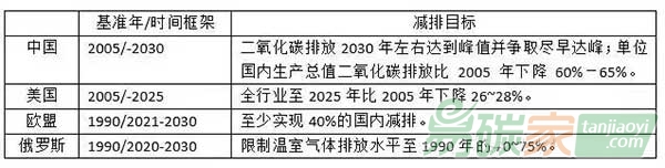 目前已經(jīng)有17個INDCs提交到UNFCCC,代表了45個締約方。主要的溫室氣體排放國都已經(jīng)提交,包括了中國、美國、歐盟、俄羅斯,如下表所示。從各國提交的減排目標可以看出,歐盟仍保持著應(yīng)對氣候變化先鋒的角色,提出的目標也與IPCC評估報告中指出的減排水平一致。而美國也提出了較為大膽的目標,但是由于基準年不同,不便做直接的比較。