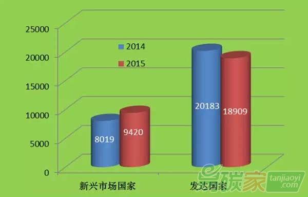 圖4  2014、2015“500強”發(fā)達國家與新興市場國家上榜企業(yè)總營業(yè)收入(單位:億元)