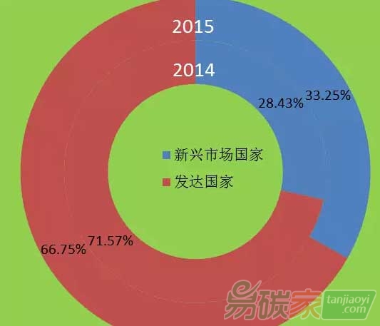 圖5  2014、2015“500強”發(fā)達國家與新興市場國家上榜企業(yè)總營收占比圖