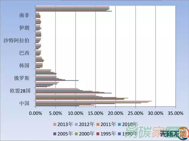 圖1.全球各國(guó)歷年溫室氣體排放量占世界總排放量比例情況圖