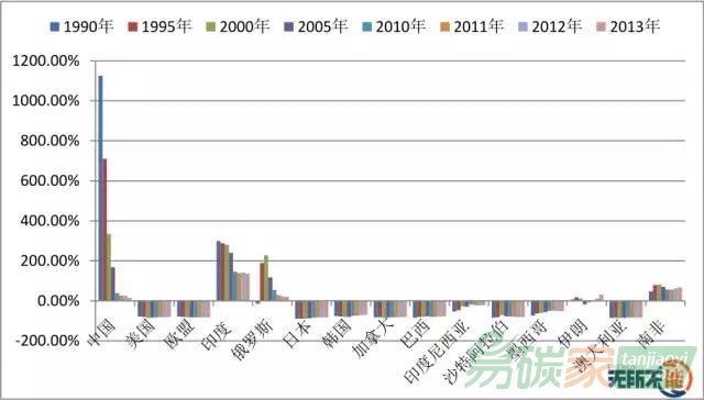圖4,各國(guó)在1990年-2013年間單位實(shí)際GDP溫室氣體排放與世界平均排放水平差對(duì)比圖