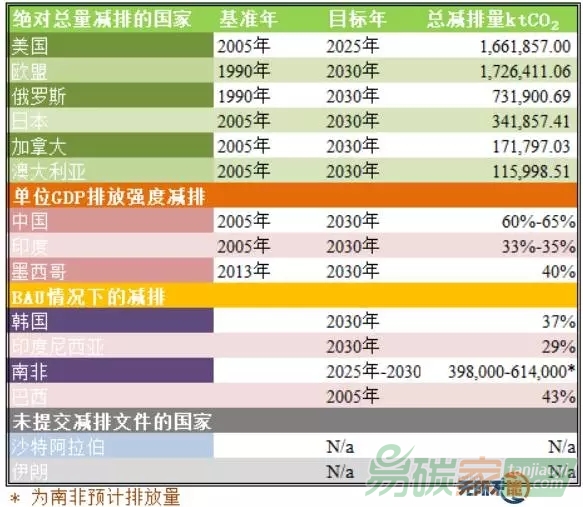 由于指南是非強(qiáng)制性的,因此,從目前提交的國(guó)家自主貢獻(xiàn)文件來看,內(nèi)容是五花八門的。從減排效果上來看,即使承諾單位GDP排放強(qiáng)度降低的國(guó)家和BAU減排的國(guó)家的排放總量不增加,總量減排的國(guó)家最高減排目標(biāo)也僅僅相當(dāng)于在2010年世界總排放量的基礎(chǔ)上減排14.40%。肯定是完不成巴黎氣候大會(huì)的既定目標(biāo)。