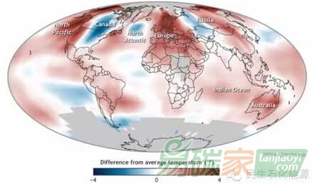 美國國家海洋和大氣治理署(NOAA)2015年全球氣候年度報告數(shù)據(jù)顯示,去年是有現(xiàn)代氣象記錄數(shù)據(jù)以來135年中最炎熱的一年。下圖顯示了去年氣溫與以往正常溫度之間的差距。世界絕大部分地區(qū)的氣溫都有顯著升高,北美東部成為世界上為數(shù)不多溫度較低的地區(qū)之一。