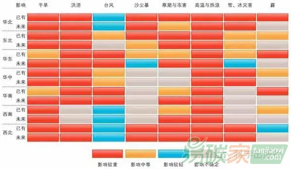 中國七大區(qū)極端天氣氣候事件和災害的影響程度,據(jù)《中國氣候與環(huán)境演變:2012》改繪(影響較重指極端天氣氣候事件或災害已造成很大損失或未來風險偏高;影響較輕指已造成損失較小或未來風險偏低;影響中等指損失或風險介于前二者之間;影響不確定指尚無法判斷損失程度或風險水平)