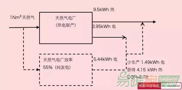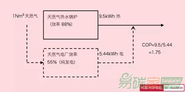 舉例說明,如圖2所示,采用燃氣蒸氣聯(lián)合循環(huán)的天燃氣電廠,純發(fā)電效率可超過55%,即1 m3天燃氣可產(chǎn)電5.44 kW?h。而對于天燃氣熱電聯(lián)產(chǎn)項目,其發(fā)電效率為40%,供熱效率為42%,這時1 m3天燃氣可以同時產(chǎn)生3.95 kW?h電和4.15 kW?h熱,與天然氣純發(fā)電相比,減少了1.49 kW?h電,同時增加4.15 kW?h的熱,這相當于一臺效率為2.78的熱泵。筆者按此思路,計算了天燃氣熱水鍋爐的熱泵效率,如圖3所示,取天燃氣熱水鍋爐熱效率為88%[13],則1 m3天燃氣可產(chǎn)熱9.5 kW?h,與天燃氣純發(fā)電相比,其熱泵效率相當于1.75。