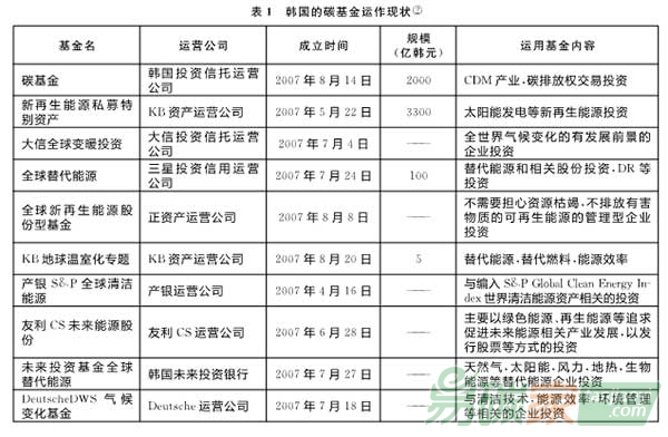碳排放基金制度在韓國(guó)的主要運(yùn)作方式是在金融市場(chǎng)內(nèi)募集,組建基金后,對(duì)減少溫室排放相關(guān)產(chǎn)業(yè)或排放權(quán)交易投資。2007年8月,碳基金機(jī)構(gòu)“韓國(guó)私募碳特別資產(chǎn)一號(hào)”誕生,投資領(lǐng)域集中于新再生能源。作為第一期投資對(duì)象,在韓國(guó)全羅南道寶城郡、慶尚北道昌寧郡都進(jìn)行了1MW級(jí)的2項(xiàng)太陽能發(fā)電產(chǎn)業(yè)?,F(xiàn)在,通過招標(biāo)選拔最終中標(biāo)的“韓國(guó)信托運(yùn)營(yíng)公司”承擔(dān)了基金的具體運(yùn)營(yíng)。能源管理工業(yè)園區(qū)是碳基金的主管部門,并且作為最大投資方對(duì)基金的運(yùn)營(yíng)進(jìn)行積極的管理。