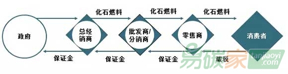 BC省的碳稅征收模式采用末端征稅法,即在化石燃料銷售的末端環(huán)節(jié)征稅。納稅義務(wù)人是化石燃料的最終消費(fèi)者。具體作法是,在首次銷售化石燃料時(shí),總經(jīng)銷商向政府繳納與終端消費(fèi)者所繳納碳稅額度相當(dāng)?shù)谋WC金,之后批發(fā)商/分銷商和零售商分別向總經(jīng)銷商和分銷商繳納保證金,終端消費(fèi)者向零售商購買化石燃料時(shí)繳納碳稅(見圖3)。