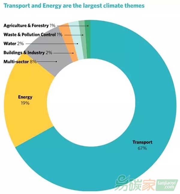 低碳交通債券規(guī)模最大(4640億美元,占67%),其次是清潔能源(1300億美元,占19%),其余970億美元(14%)為建筑和工業(yè)、農(nóng)林、廢棄物和污染、水以及多領(lǐng)域債券,這個(gè)小跡象令人歡迎,說(shuō)明債券發(fā)行更加多元化。