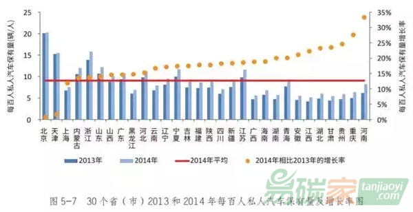 安徽2013年的單位面積煤炭消耗量分別位于全國第1、3、8和12位,這4個(gè)省(市)聚集形成一個(gè)高耗煤區(qū)域,給長三角地區(qū)的空氣質(zhì)量帶來了很大挑戰(zhàn)。30個(gè)省(市)2014年每百人私人汽車保有量的平均值為9.06輛,較2013年增長約17%,機(jī)動車污染控制壓力空前。