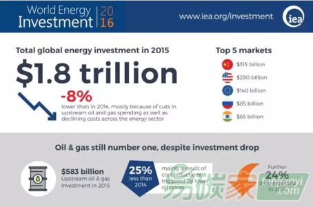 根據(jù)報(bào)告的統(tǒng)計(jì),石油和天然氣仍占據(jù)世界能源投資的主導(dǎo)地位。但是受到油價(jià)低迷的影響,石油生產(chǎn)行業(yè)的投資已經(jīng)嚴(yán)重縮減。由于可再生能源設(shè)備的生產(chǎn)成本持續(xù)下降,天然氣發(fā)電也受到?jīng)_擊,整個(gè)油氣領(lǐng)域的投資比2014年下降了25%。報(bào)告預(yù)測,2016年該領(lǐng)域的投資會(huì)再減少24%:這將是過去30年來首次出現(xiàn)連續(xù)兩年的投資下降。2017年的油氣投資則會(huì)趨向平穩(wěn)。