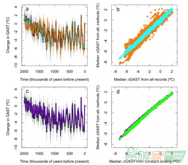 本圖比較了通過(guò)不同的計(jì)算方法得出的過(guò)去200萬(wàn)年的氣候變化趨勢(shì)。