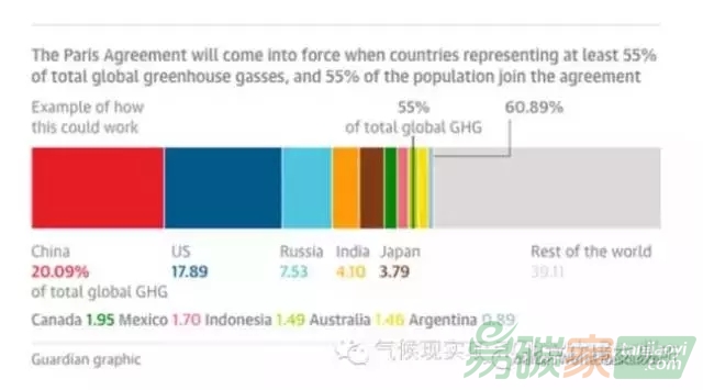根據(jù)《公約》秘書處提供的計算生效所需溫室氣體排放占比的數(shù)據(jù),排名靠前的締約方包括:中國(20.09%)、美國(17.89%)、歐盟(12.08%)、俄羅斯(7.53%)、印度(4.10%)、日本(3.79%)、巴西(2.48%)、加拿大(1.95%)、韓國(1.85%)、墨西哥(1.70%)。