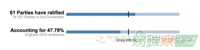 目前197個締約方中有61個已經(jīng)批準通過,滿足了55個締約方批準通過協(xié)定的要求。但在溫室氣體排放量上,目前批準協(xié)定的締約方只占了47.79%,仍有7.21%的排放量沒有達標(biāo)。
