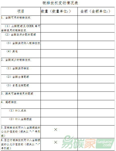 注:除“因碳排放權(quán)而計(jì)入當(dāng)期損益的公允價(jià)值變動(dòng)”項(xiàng)目外,上表中的金額欄應(yīng)當(dāng)以資產(chǎn)負(fù)債表日碳排放權(quán)公允價(jià)值計(jì)量的金額列報(bào)。