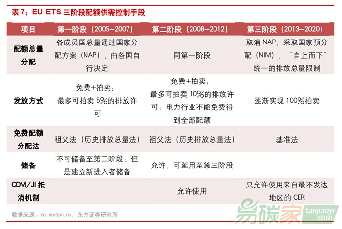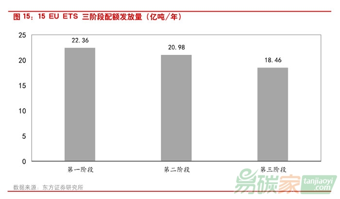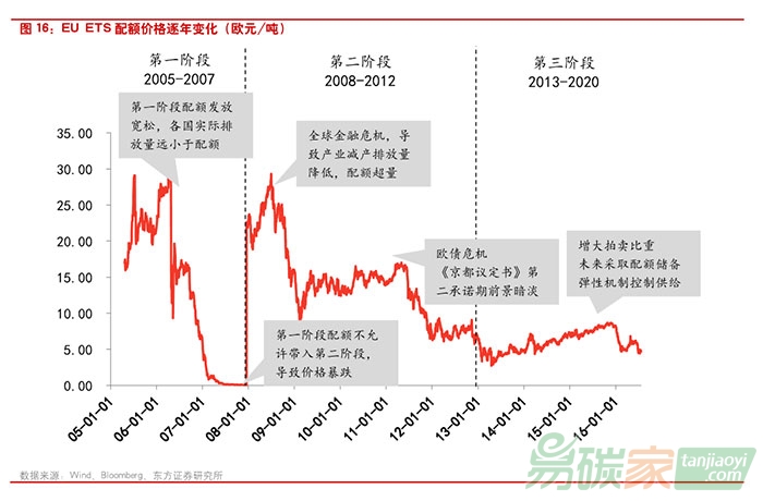 減排成果例如核證減排量(CER)等的使用從而減少其對(duì)配額需求的沖擊,并規(guī)定第二階段末未使用的配額可流入第三階段使用,EUA的價(jià)格在第二階段穩(wěn)定在10-15歐元/噸的區(qū)間波動(dòng)。