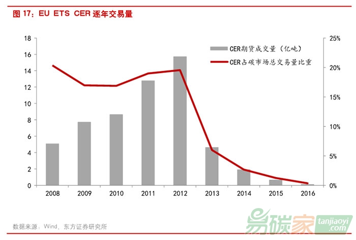 由于經(jīng)濟(jì)下滑以及碳排放權(quán)供大于求,CER的交易量近年也陷入低迷。CER期貨交易量從2012年后急劇下降持續(xù)走低。