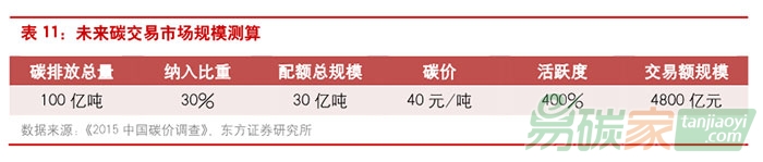 碳交易市場比重30-40%測算,未來中國碳排放配額交易市場規(guī)模將在30億噸以上,與歐盟總排放量水平相當(dāng)。基于中國碳