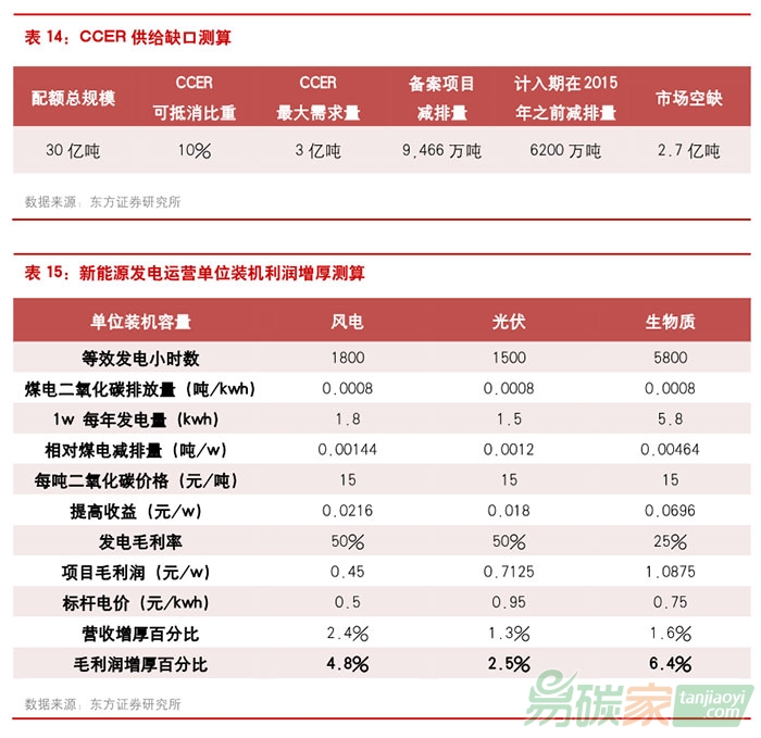 以15元/噸的CCER價格估算,CCER仍具有20億元以上的開發(fā)空檔。風(fēng)電、光伏及生物質(zhì)單位發(fā)電毛利潤將增厚4.8%、2.5%和6.4%,生物質(zhì)最為顯著。