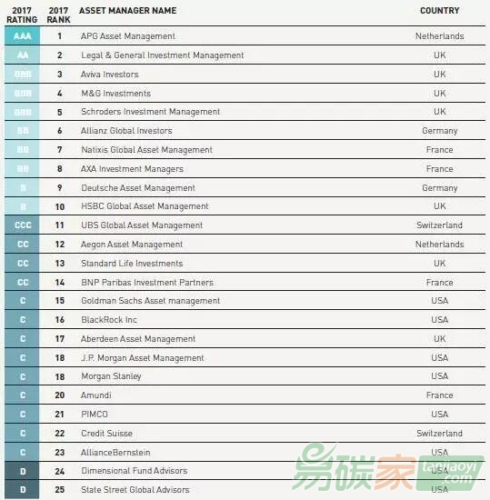 在2017年的全球氣候指數(shù)報(bào)告中,AODP還對(duì)全球排名前50位的資產(chǎn)管理商應(yīng)對(duì)氣候風(fēng)險(xiǎn)的情況進(jìn)行了評(píng)估,而這50家資產(chǎn)管理機(jī)構(gòu)中,沒有一家是中國機(jī)構(gòu)。評(píng)估中有3家機(jī)構(gòu)被評(píng)級(jí)為“X”,且都為美國機(jī)構(gòu)。