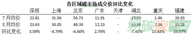 北京試點配額價格最高,8月公開交易均價為48.39元/噸;