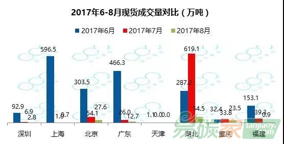 深圳成交2.8萬噸,與7月相比下降59.3%;上?,F(xiàn)貨成交0.7萬噸,比7月下降36.6%;北京成交27.6萬噸,與7月相比下降48.9%;廣東成交12.7萬噸,與7月相比下降51%;天津無交易;湖北成交54.5萬噸,與7月相比下降91.2%;重慶成交23.5萬噸,與7月相比下降30.6%;福建成交0.93萬噸,比7月下降97.6%。