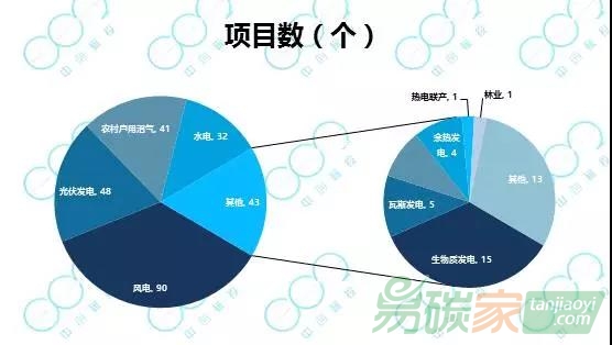 從項目類別看,已獲得減排量備案且材料公示的254個項目中,有第一類項目139個,合計備案減排量1890萬噸CO2e;第二類項目17個,備案減排量372萬噸CO2e;第三類項目98個,備案減排量3031萬噸CO2e。從項目類型看,風(fēng)電、光伏、農(nóng)村戶用沼氣、水電等項目較多,詳細情況如下圖所示。