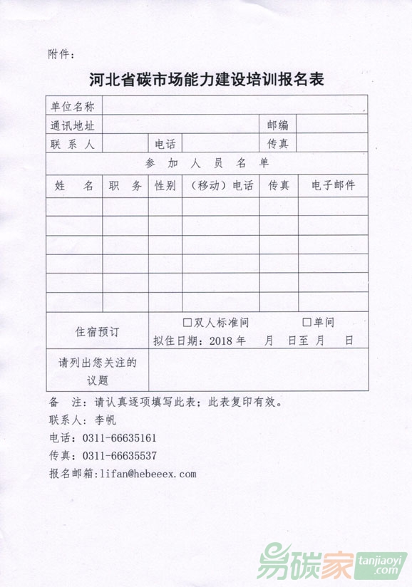 (請登錄河北環(huán)交所官網(wǎng)www.hebeeex.com下載《河北省碳交易能力建設培訓報名表》)