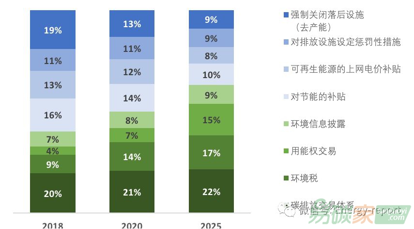 受訪者被問及其預(yù)計(jì)未來推動(dòng)溫室氣體減排最重要的政策是什么(圖3)。結(jié)果顯示,受訪者預(yù)計(jì),隨著時(shí)間的推移,政策重點(diǎn)將轉(zhuǎn)向碳市場、環(huán)境稅、信息披露和能源補(bǔ)貼交易等基于市場的政策工具。