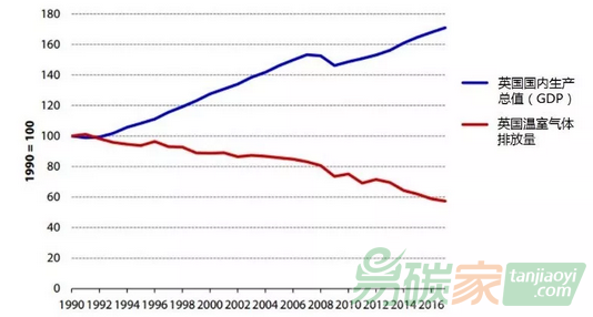 圖1 1990—2017年英國溫室氣體排放量與國內(nèi)生產(chǎn)總值