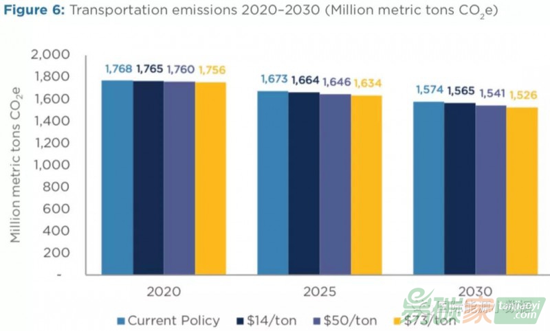第二,碳稅對(duì)電力部門的煤電廠影響最大(煤電廠加速退役),到2030年因?yàn)樘级悓?shí)現(xiàn)的減排量中80%來自電力部門。如果碳稅為50美元/噸,那么2030年電力部門碳排放為6.76億噸,比沒有碳稅的情境下的排放量降幅達(dá)61%。而50美元/噸的碳稅對(duì)于交通部門的減排量影響非常小(-2%)。