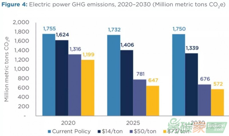 第一,碳稅有助于減排,但是需要達(dá)到較高的碳價(jià)水平才能充分發(fā)揮作用。如果碳稅達(dá)到50美元/噸的時(shí)候,美國(guó)2025年代碳排放量將比2005年下降39%-46%(美國(guó)奧巴馬政府的減排目標(biāo)是26%-28%)。如果2050年代減排目標(biāo)是比2005年下降80%,那么屆時(shí)碳稅需要超過100美元/噸。