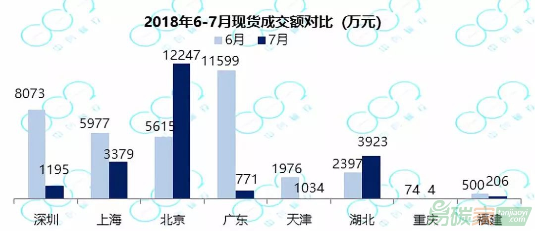 截至2018年7月31日,一、二級現(xiàn)貨市場累計成交2.57億噸,成交額57.25億元。廣東、湖北成交量最高,位于第一梯隊;深圳、上海、北京位于第二梯隊;而天津、重慶、福建的成交量相對較低,位于第三梯隊。