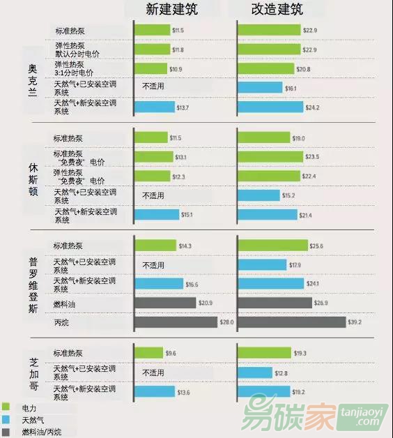 碳減排影響。我們對加州奧克蘭、休斯頓、羅德島普羅維登斯和芝加哥等四座城市的新建住宅及改造住宅在不同電價結(jié)構(gòu)下,利用電能和化石燃料供暖和提供生活熱水的各種指標(biāo)進(jìn)行了對比。