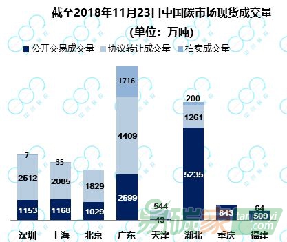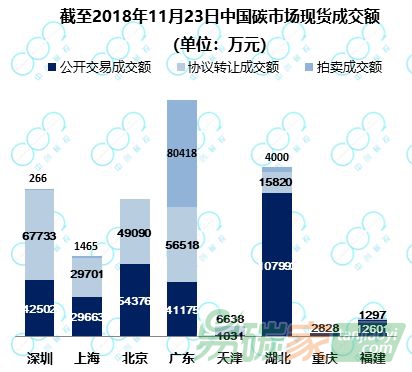 截至2018年11月23日,8個區(qū)域碳市場一、二級現(xiàn)貨市場累計成交2.72億噸,成交額60.51億元。廣東、湖北成交量最高,位于第一梯隊;深圳、上海、北京位于第二梯隊;而天津、重慶、福建的成交量相對較低,位于第三梯隊。
