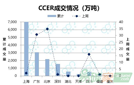 上周,8個區(qū)域碳市場CCER交易較為活躍。其中上海市場CCER成交2萬噸,廣東市場CCER成交30.6萬噸,北京市場CCER成交34.7萬噸,深圳市場CCER成交1萬噸,