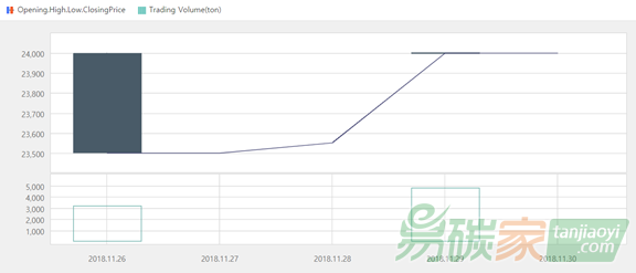 2018年11月26日至2018年12月02日,韓國(guó)碳市場(chǎng)價(jià)格在23500-24000韓元/噸之間波動(dòng)(約20.78-21.43美元/噸)。