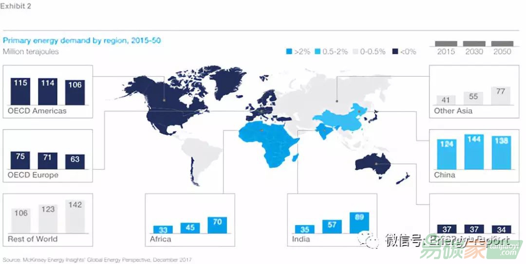 從總體上看,我們看到,在全球能源需求繼續(xù)增長的同時,增長速度卻在迅速放緩。經(jīng)過幾十年的初級能源需求年增長率超過2%,我們預(yù)計世界將經(jīng)歷一段緩慢增長的時期——2015-30年的年增長率為0.9%,2030-50年的年增長率僅為0.5%。如果我們看看這些發(fā)展背后的驅(qū)動因素,我們就會發(fā)現(xiàn),持續(xù)增長是由人口和經(jīng)濟擴張驅(qū)動的,尤其是新興經(jīng)濟體中不斷壯大的中產(chǎn)階級。與此同時,有兩個結(jié)構(gòu)性發(fā)展將導(dǎo)致這種增長放緩。首先,許多國家的經(jīng)濟結(jié)構(gòu)將發(fā)生轉(zhuǎn)變,人口老齡化和從工業(yè)向服務(wù)業(yè)的全面過渡。我們已經(jīng)在許多高收入國家看到了這種發(fā)展,現(xiàn)在預(yù)計在中國等國也會出現(xiàn)同樣的情況。其次,由于向更節(jié)能的燃料和技術(shù)的轉(zhuǎn)變,能源強度將有很大改善。例如電氣化,即用電作為傳統(tǒng)燃料的替代品,以及家庭和工業(yè)部門使用的設(shè)備和機器的能源效率更高。從地理上看,我們預(yù)計經(jīng)合組織國家(2015年占全球40%)的能源需求將加速下降,中國(2015年占全球22%)的能源需求將在2030年左右見頂。增長最強勁的地區(qū),尤其是非洲和印度,起點較低(各占2015年總需求的6%),但到2050年將超過歐洲的需求水平。