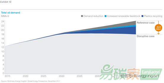 化工行業(yè)穩(wěn)定的油氣需求增長與化學(xué)物質(zhì)之間的需求強勁和GDP和人口的增長有很強的相關(guān)性,以及與大部分的石油和天然氣作為原料而不是能源(~ 80%的石油和天然氣化學(xué)物質(zhì)作為原料)有關(guān)。預(yù)期的能源效率提高將主要減少非原料的化石燃料需求。要了解化石燃料在化學(xué)行業(yè)的未來,有三個趨勢是值得關(guān)注的。對化工產(chǎn)品,特別是塑料制品的需求塑料的使用面臨越來越大的監(jiān)管壓力。我們預(yù)計,2030年后,由于使用和替代減少,原生塑料消費(主要使用基于液體的原料)和GDP增長將脫鉤。塑料回收利用目前人們對循環(huán)性和可回收性有很多關(guān)注。然而,要增加對難回收塑料的回收利用,還需要改進(jìn)消費廢物收集、技術(shù)突破和產(chǎn)業(yè)規(guī)模。生物基(biobased)替代品生物基替代品一方面對可再生原料的需求可能導(dǎo)致選定生產(chǎn)路線,另一方面對這些趨勢的敏感性很高。在一個顛覆性的場景中,我們假設(shè)這些趨勢每一個都比我們的參考案例翻倍,那么化學(xué)石油需求將在2030年達(dá)到峰值,到2050年,需求將比我們的參考案例低25%左右。