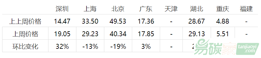 福建市場無成交。 在近兩周發(fā)生連續(xù)交易的市場內(nèi),各配額市場的價格走勢基本保持平穩(wěn),除深圳價格漲幅達到32%之外,其他市場的價格浮動范圍均不超過20%,其中湖北和廣東的表現(xiàn)最為穩(wěn)定,成交價格與前一周基本保持一致,上海和北京的平均成交價格有所下跌,降幅分別為13%和19%,重慶的平均成交價格有所上浮,漲幅為13%。