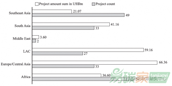 研究中,我們使用GDP中心CGEF數(shù)據(jù)庫提供的融資數(shù)據(jù),估算了中國海外能源投資的分布。該數(shù)據(jù)庫包括2000年至2018年初兩家中國主要政策性銀行的199項(xiàng)海外投資信息,投資總額達(dá)2281.05億美元,分布在世界七個(gè)地區(qū)(63個(gè)國家)。