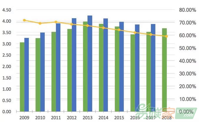 綠柱:煤炭生產(chǎn)量(單位:十億噸),藍(lán)柱:煤炭消費(fèi)量(單位:十億噸),黃線:煤炭消費(fèi)占比