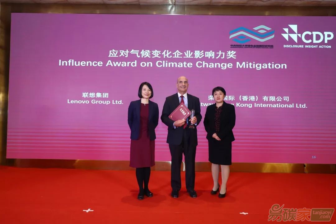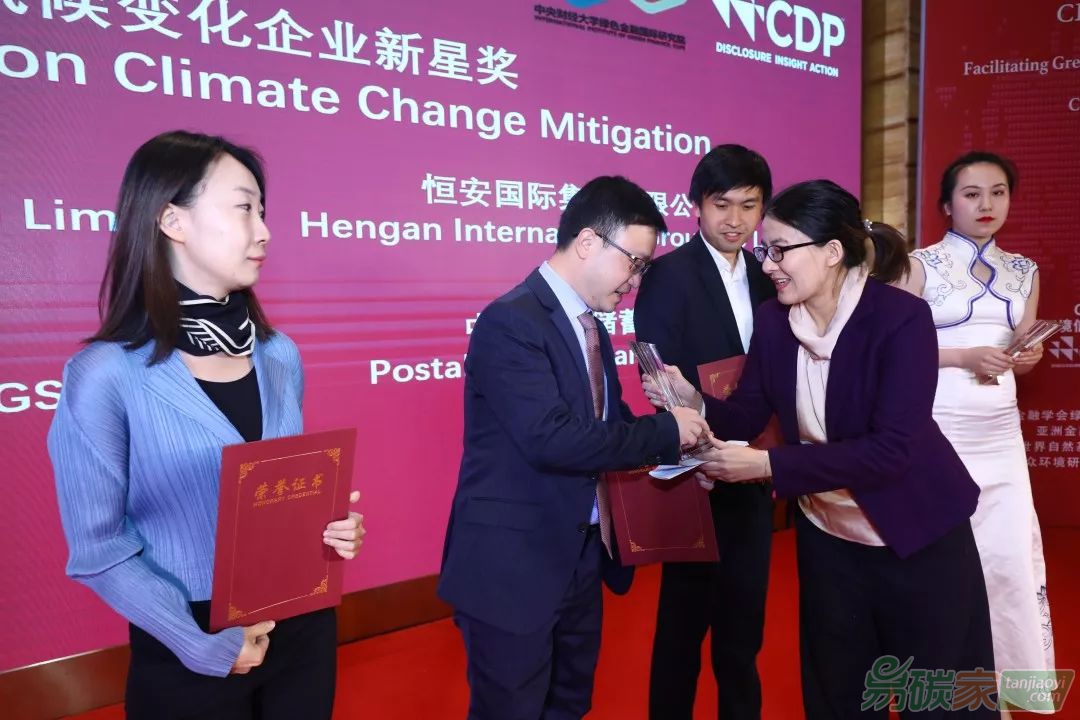 中央財經(jīng)大學綠色金融國際研究院院長王遙,亞洲金融合作協(xié)會副秘書長龐魁霞,CDP中國辦公室主任張譯戈,中國金融學會綠色金融專業(yè)委員會主任,清華大學國家金融研究金融與發(fā)展研究中心主任,中國人民銀行貨幣政策委員會委員馬駿,CDP主席Paul Dickinson為獲獎企業(yè)頒獎