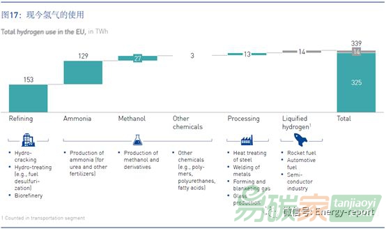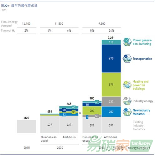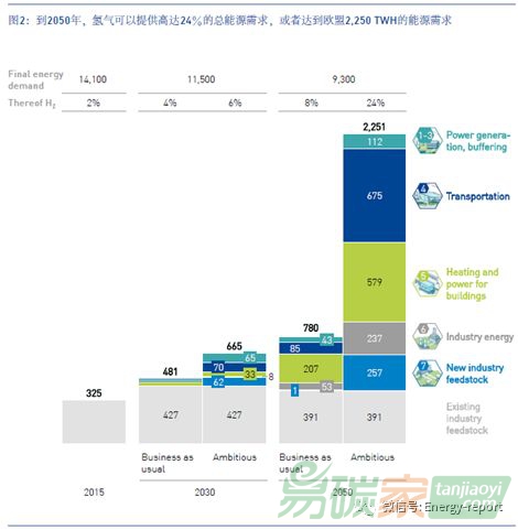 在整個行業(yè)中,我們看到2050年歐洲可能產(chǎn)生大約2,250太瓦時(TWh)的氫氣,約占歐盟總能源需求的四分之一(見圖2)。這一數(shù)字將為大約4200萬輛大型汽車、170萬輛卡車、大約25萬輛公共汽車和5500多輛火車提供燃料。它的供熱量將超過相當于5200萬戶(約465太瓦時),并提供高達10%的建筑用電需求。在工業(yè)中,大約160 TWh的氫將產(chǎn)生高等級的熱量,另外140 TWh將以直接還原鐵(DRI)的形式取代煉鋼過程中的煤。120 TWh的氫與生物質(zhì)中捕獲的碳或碳結(jié)合,也將在2050年為40 Mt化學品生產(chǎn)合成原料。實現(xiàn)這一愿景將使歐盟走上到2050年減少約560 Mt二氧化碳排放量的道路,這相當于實現(xiàn)2度方案所需