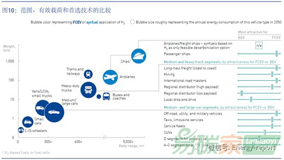 在運輸方面,氫是卡車、公共汽車、輪船、大型汽車和商用車最有前途的脫碳選擇,其中較低的能量密度(因此較低的范圍)、較高的初始成本和電池的緩慢充電性能是主要缺點。與電池和內(nèi)燃機相比,燃料電池需要更少的原材料。由于運輸部門約占歐盟二氧化碳排放總量的三分之一,因此脫碳是實現(xiàn)能源轉(zhuǎn)型的關(guān)鍵因素。此外,氫燃料補給設施具有顯著的優(yōu)勢:與快速充電相比,它僅需要城市和高速公路的大約十分之一的空間。同樣,供應商可靈活供應氫氣,而大規(guī)模部署快速充電設施需對電網(wǎng)進行重大升級。最后,一旦實現(xiàn)了最小規(guī)模的推廣,氫氣為運營商提供了一個有吸引力的商業(yè)案例。在