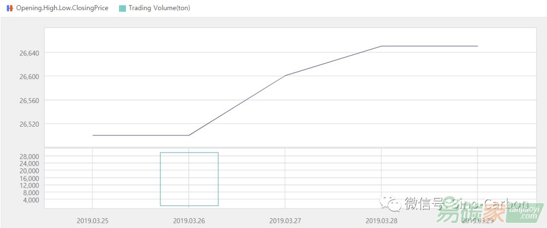 韓國碳市場2019年03月25日至2019年03月31日,韓國碳市場價(jià)格在26500-26650韓元/噸之間波動(dòng)(約23.38-23.51美元/噸)。