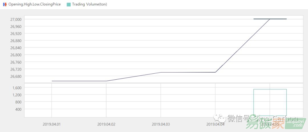 韓國碳市場2019年04月01日至2019年04月07日,韓國碳市場價格在26650-27000韓元/噸之間波動(約23.42-23.73美元/噸)。