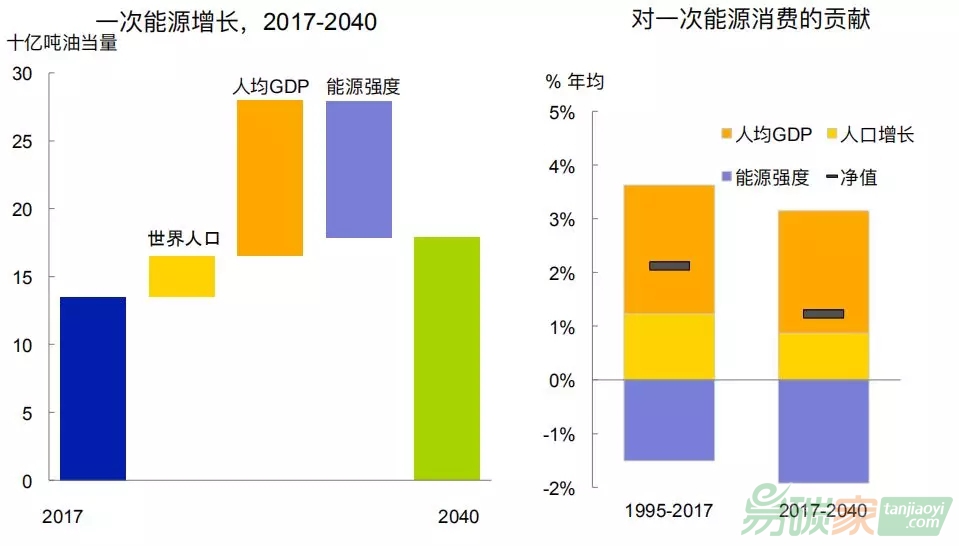 ◆能源需求的增長將很大程度上被能源強度(單位GDP能耗)下降所抵消,單位原料創(chuàng)造的價值不斷增加:在展望期間全球GDP增長將超過一倍,能源消耗僅增加三分之一。