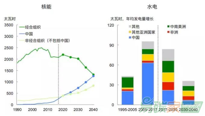 ◆ 發(fā)電量繼續(xù)增長的核能分為兩種相反的模式:隨著舊核電站逐漸退役以及非常有限的建設投資,經(jīng)合組織核能發(fā)電量實質(zhì)性降低。相反,中國核能發(fā)電強勁增長,展望期間上升1000太瓦時。到2040年,中國的核能發(fā)電量與整個經(jīng)合組織處于相似水平。